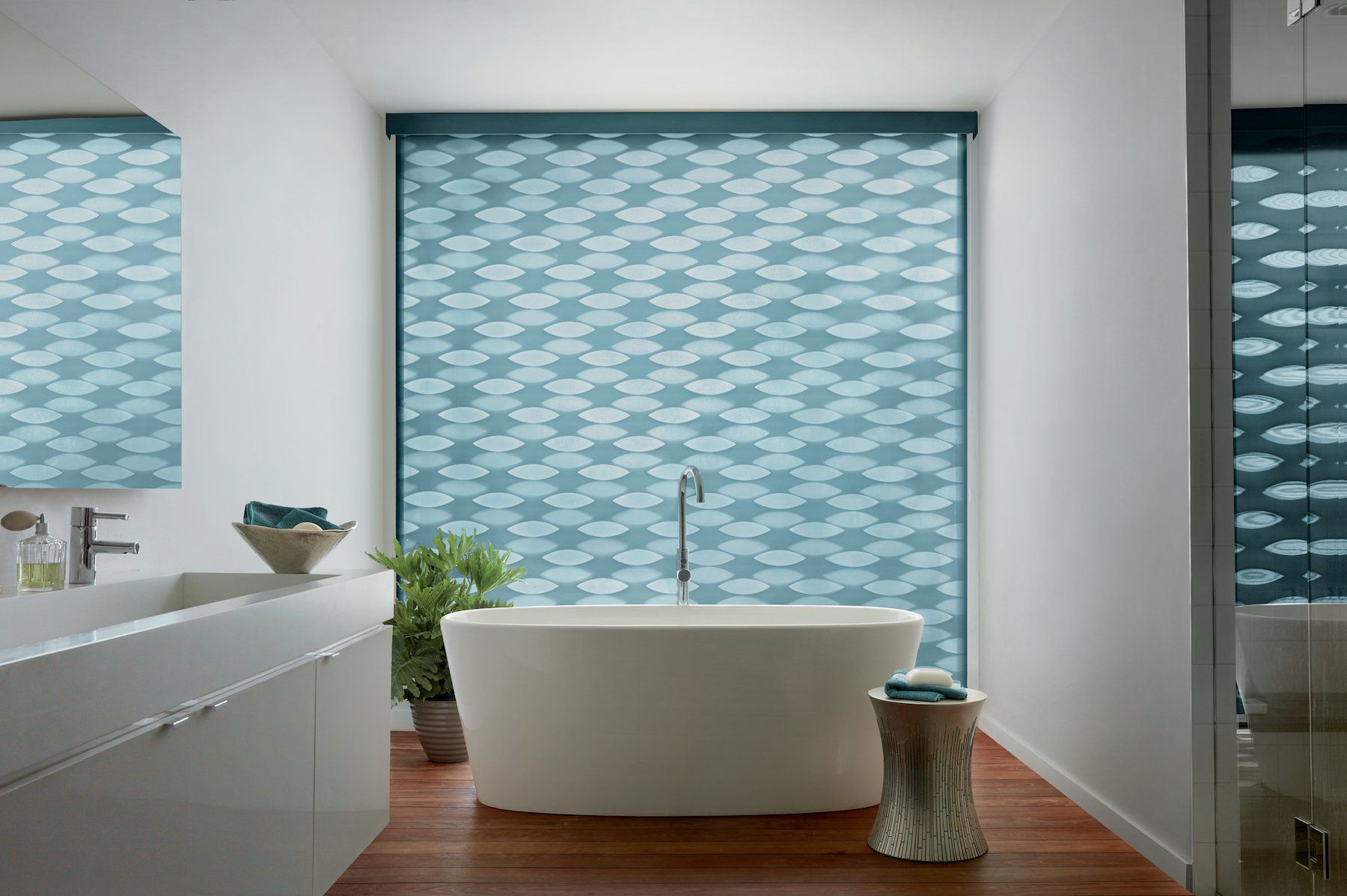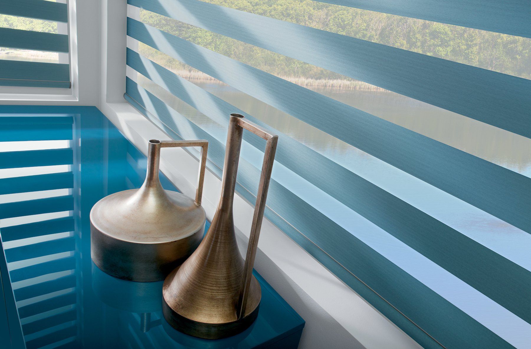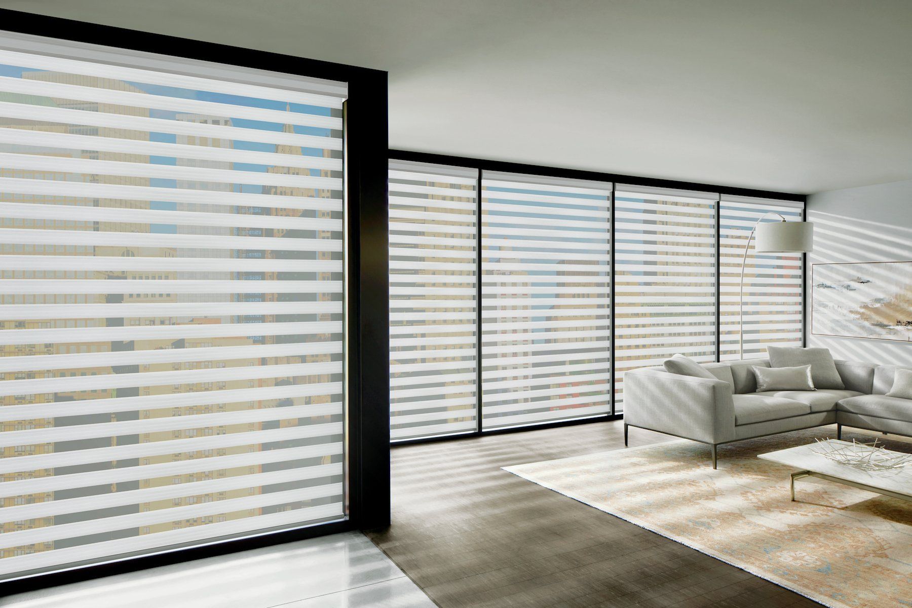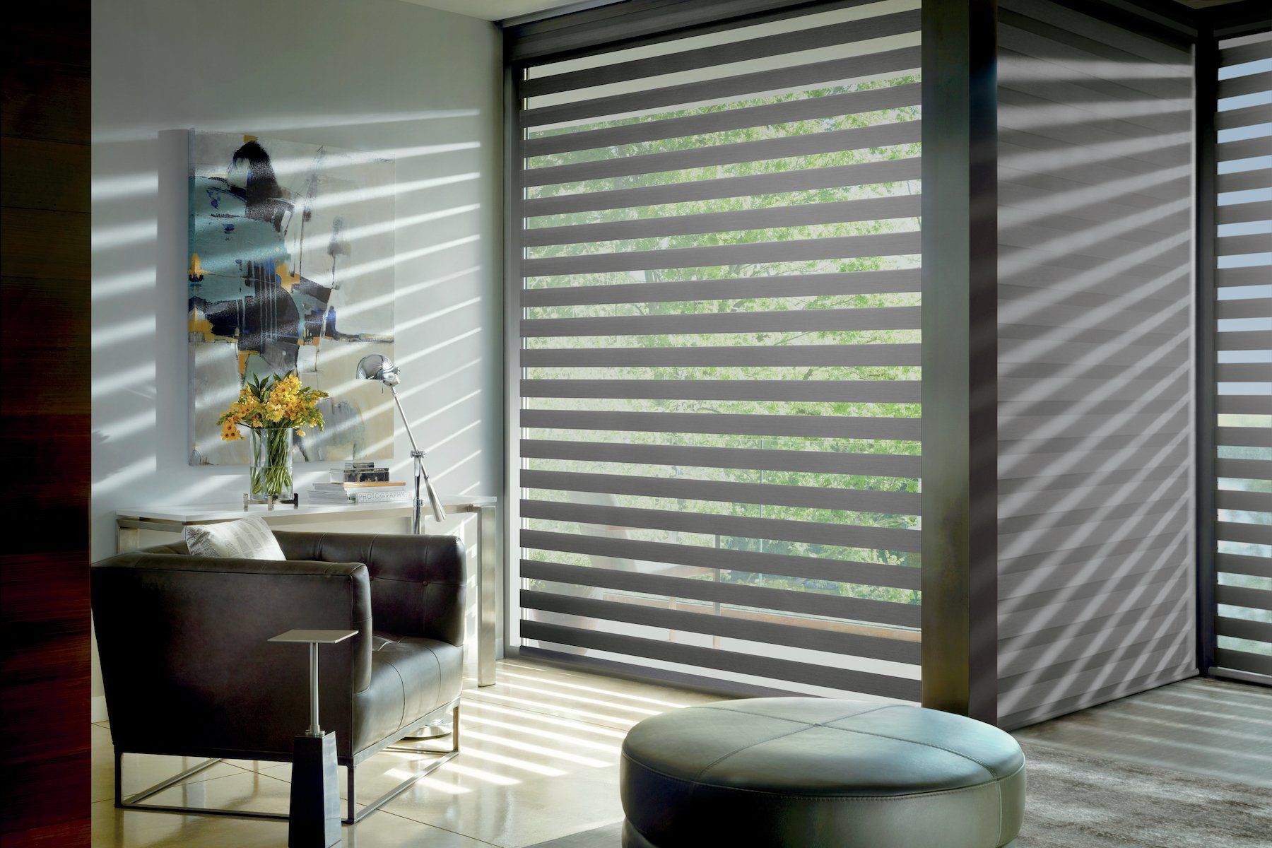 Designer Banded Shades combine alternating sheer and solid bands in a single shade. Shift the solid bands to overlap, and you ensure privacy. Align the solid bands, and you get natural, diffused light.